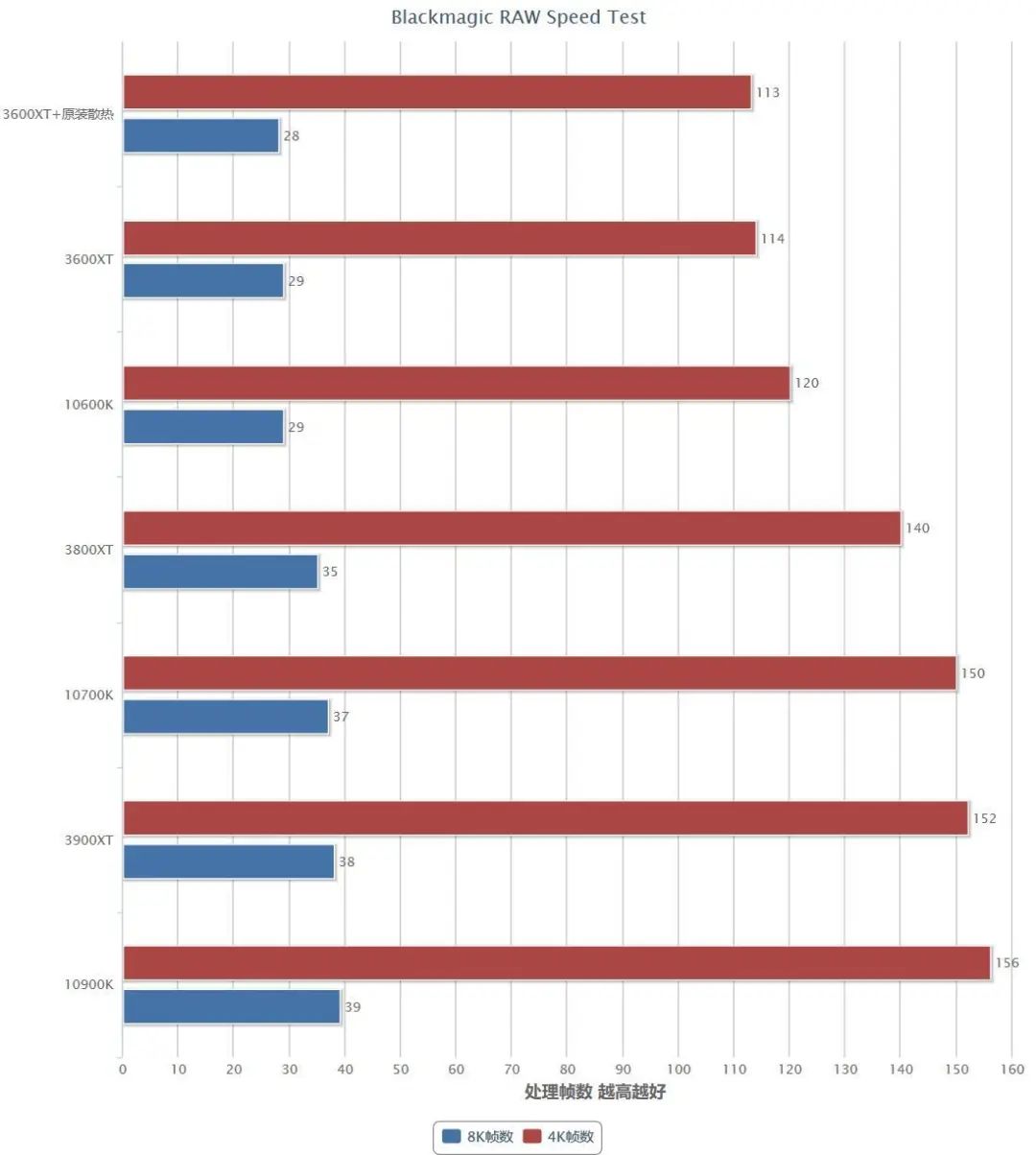 Blackmagic出品的RAW视频处理基准测试,处理8K分辨率各档处理器间的差距不大,4K分辨率的intel占优些,8K能相差有10帧, 4K下10900k vs 3990XT 也仅相差4帧。