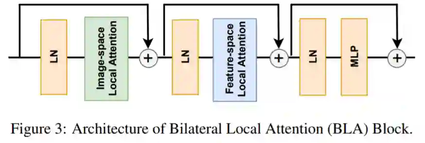 最后,将 FSLA 模块的输出送入另一个归一化层和一个 MLP 模块进行处理,再通过一个短路连接得到整个 bilateral local attention 模块的输出: