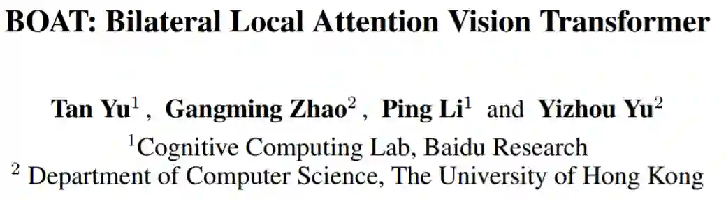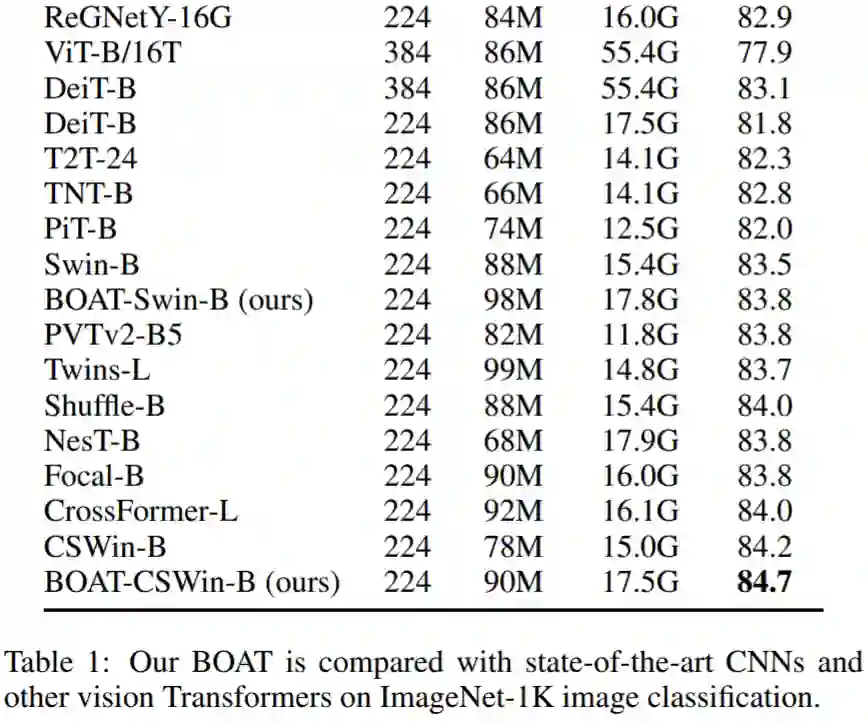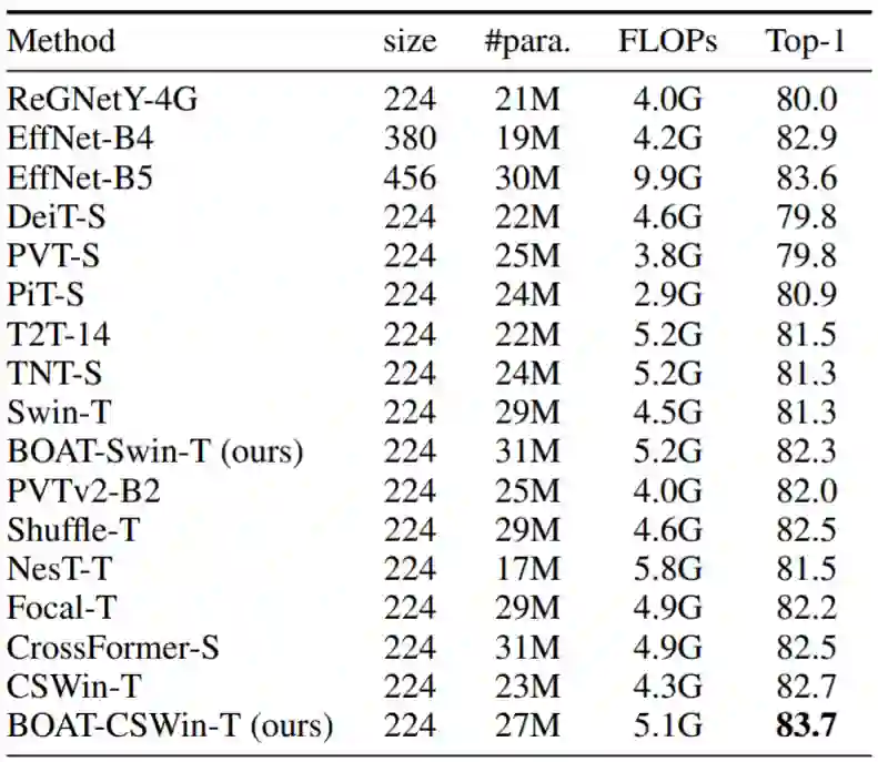 BOAT 遵循与其它 ViT 相同的训练策略。本文使用 ImageNet-1K 的训练集训练模型,输入图像使用 224×224 分辨率,并且没有外部数据。