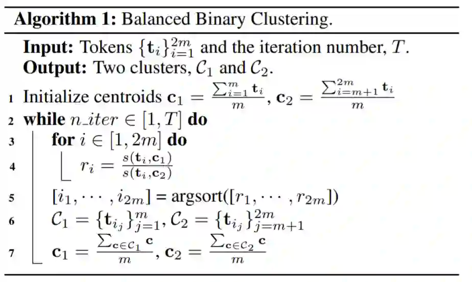 假如某个类组原先有 2m 个 token,均衡二分聚类后得到的每组的 token 数量为 m。与 K-means 类似,均衡二分聚类是一个迭代算法并且依赖于聚类中心。如以下算法所示,在每次迭代对所有 token 进行分组时,先计算每个 token 到两个聚类中心的距离比值,然后把所有 token 按距离比值的递减顺序排序,最后将排序列表前半部分 m 个 token 赋给第一组,后半部分 m 个 token 赋给第二组。