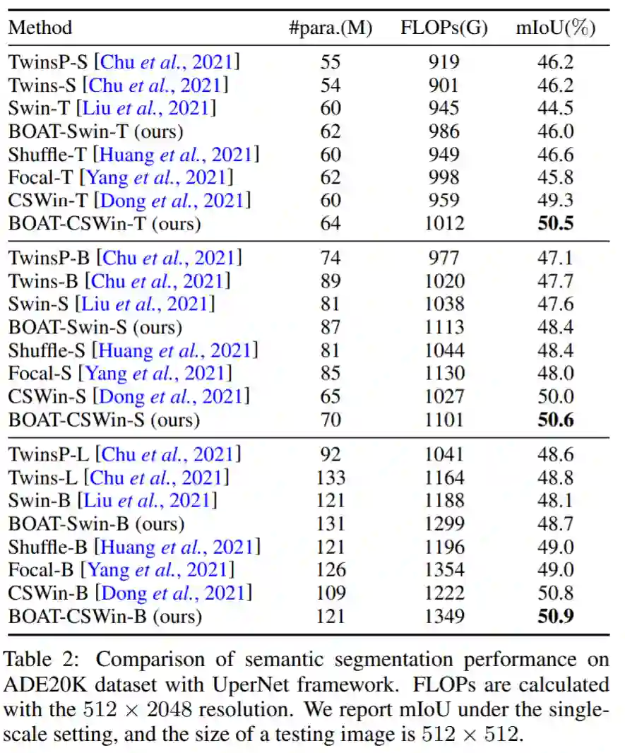 具体来说,训练 300 个 epochs,使用 AdamW 优化器、余弦学习速率调度器和一个线性预热过程。BOAT 在多个数据集上都取得了 SOTA 的效果。比如,在 ImageNet-1K 测试集上,BOAT-CSWin-T 取得了 83.7 的 Top-1 分类准确率;在 ADE20K 语义分割测试集上,BOAT-CSWin-T 的 mIoU 达到了 50.5。