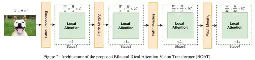 本文中的 ViT 采用了和 Swin 和 CSWin 相同的层次化金字塔架构,由一个 patch embedding 模块和若干个双边局部注意力(bilateral local attention)模块组成。