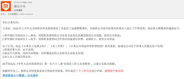 昨日晚间,小米内部通报称,两位中国区市场部员工违规舞弊,已被辞退并移送公安机关。通报邮件称,小米2019年上半年查处了多起员工违规舞弊案件。其中,原中国区市场部员工郝亮,利用职务便利将公司业务交由其近亲属持股的公司承揽;原中国区市场部员工赵芊,利用职务便利向合作供应商索要好处费,金额较大。
