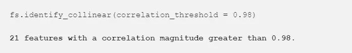 可以用热力图简洁地可视化特征的相关性。图中显示了所有至少与一个特征的相关系数大于阈值的特征: fs.plot_collinear() 与之前方式类似,