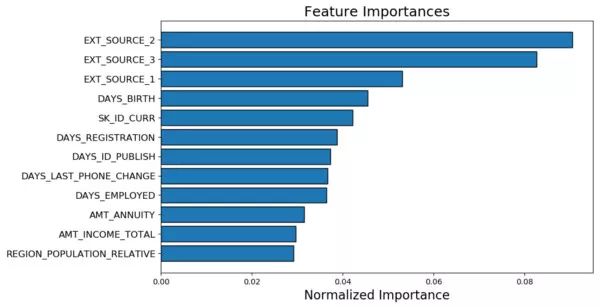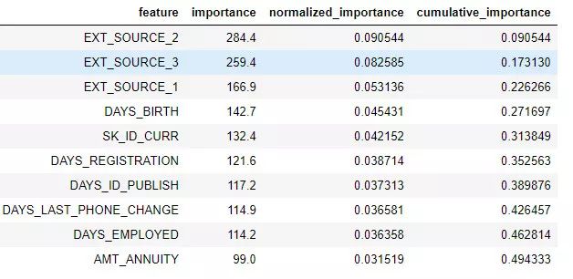 FeatureSelector 使用 GBM 从 LightGBM library 中找到特征重要度。运行 10 次以上 GBM 求平均得到特征重要性,从而减少方差。同时,模型使用验证集的 early stopping(有关闭选项),避免训练数据的过拟合。