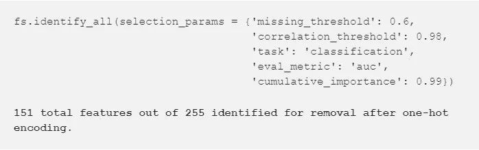 在训练机器学习模型之前,Feature Selector 类会执行一些常用操作来去除特征。它提供识别特征并去除的函数,并将之可视化。为了提高工作效率,可以单独或一次运行所有方法。