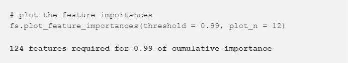 接下来的方法建立在零重要度函数上,它使用模型的特征重要度来进行之后的选择。identify_low_importance 函数找到最低重要度的特征,这些特征对特定的总重要度没有任何贡献。