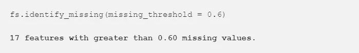 第一个找到需要被剔除的特征的方法非常直接:缺失值比率超过指定阈值。以下代码可以定位出所有缺失值比例超过 60% 的特征(粗体为输出内容)。