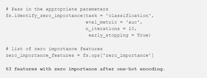 前面两种方法可以用于任何结构的数据集。并且在给定阈值下,任何时候得到的结果都是一样的。接下来一种方法适用于有监督的机器学习。我们必须有用于训练的标签,结果也是不一定的。identify_zero_importance 函数根据 GBM 学习模型找到零重要度特征。