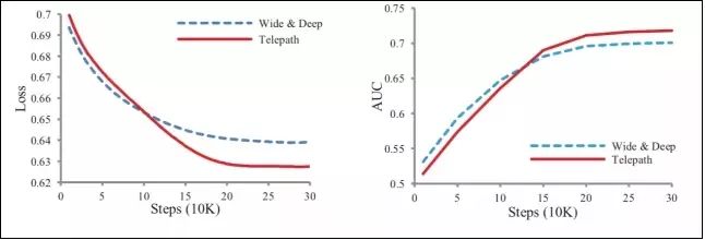 从图中可见,Telepath的Loss和AUC比起Wide & Deep网络都有一定改善。