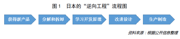 明确了创新的内涵,再回过头来看日本制造。如前文所述,日本制造业发展前期经历了一段较长时间的“山寨”过程,但是如果深挖下去,我们会发现日本所做的一切虽说是以模仿为主,但也算作是一种另类的“创新”。比如所谓的“逆向工程”,其对新产品的解构、研究与改进设计,进而到生产制造出全新的商品,均包含着不少产品创新、技术创新与市场创新的影子(参见图1)。