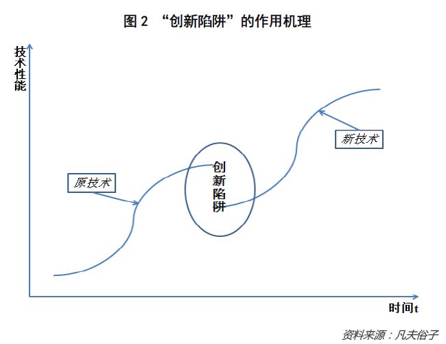 “创新陷阱”正是产生于这种新旧技术的更替过程中(参见图2)。具体来说,对于一家企业,从原有技术轨道跨向新技术轨道是一件不容易的事情;企业越是在自己原有的技术专长上加以创新,便会在原有技术轨道上走得越远;也正因为如此,企业也便越会延滞进入新的技术轨道,进而也越来越遭受旧技术极限的扼制。