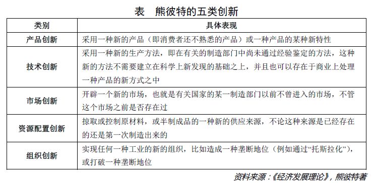 在熊彼特看来,创新包括五种情况,分别为产品创新、技术创新、市场创新、资源配置创新与组织创新,具体如下表: