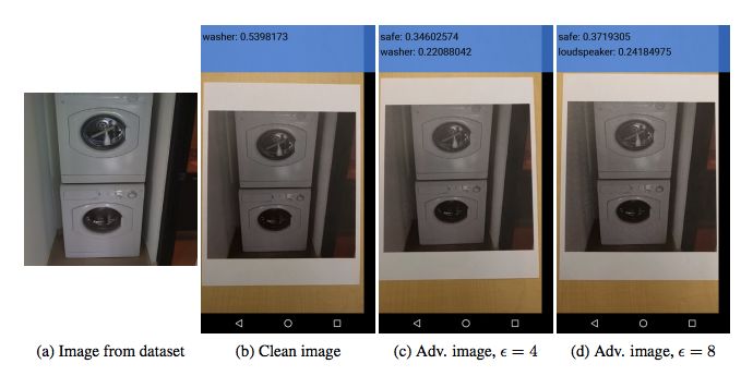 对抗样本可以在标准纸张上打印出来并用标准分辨率的智能手机拍照,并且在这种情况下仍然会导致分类器将“洗衣机”标记为“安全”