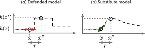 执行梯度掩码的防御策略通常会导致一个模型在特定的方向和训练点的附近非常平滑,这使得攻击者很难找到指示好候选方向的梯度,从而以损害模型的方式干扰输入。然而,攻击者可以训练一种替代模型:一种通过观察被防御模型分配给攻击者精心选择的输入的标签来模仿防御模型的副本。
