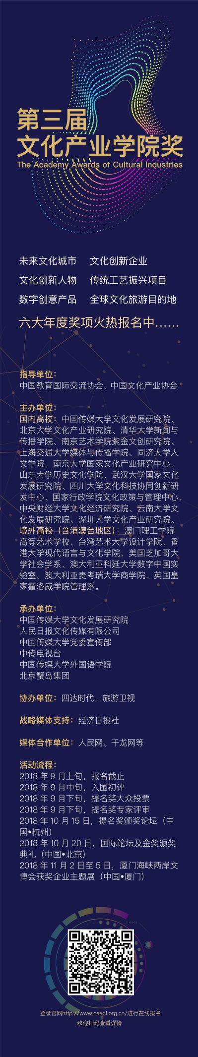 “文化产业学院奖”是由中国传媒大学发起并联合国内外知名高校共同设立的年度文化产业奖项。自2016年设立以来,“文化产业学院奖”始终坚持“独立、权威、公正、关怀”的学术态度和敏锐的时代洞察力,汇聚文化产业各界资源、搭建政产学研协作平台,成为国内外瞩目的文化产业现象级活动,被媒体盛赞为“中国文化产业的奥斯卡”。2018第三届“学院奖”由十余所国内知名学府的文化产业教学科研单位主办,同时吸纳了来自美国、澳大利亚等国外知名院校的文化产业领域学者,进一步丰富学术智囊团队,凸显学院奖的学术思考和独立性。