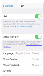 “Hey Siri!”作为预装语音助手Siri的附加功能,于2014年9月在iOS 8中发布。然而,在iOS 9(2015年9月)它升级了,只允许被用来识别用户的个性化语音。
