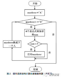 本案例的算法设计如图2 所示。算法是先假设凶手是A,然后判断这四个人说的话是否有三句是真实的(显然,若A 为凶手,A、B、C 都说了假话,排除); 再假设凶手是B,再一次判断这四名嫌疑人的话是否有三句是真实的,以此类推,直到假设凶手是D 时结束。其中谁的假设条件满足有三句话是真实的,那该人就是凶手,最后推出凶手是C(此时A、B、D 都说的是真话,C 说了假话)。