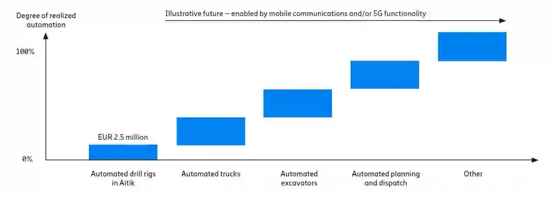 5G通信系统可以满足Boliden最高的需求,包括带宽、网络服务质量、时延和定位。通过引入高性能的通信网络,矿场变得更加安全和高效。虽然有一部分应用需要传输的数据量并不大,但像远程实时操控机器这样的应用,只有5G通信系统才有实现的能力,有了5G的赋能之后,采矿业会成为创新领域之一,产生出新的应用和商业模式。