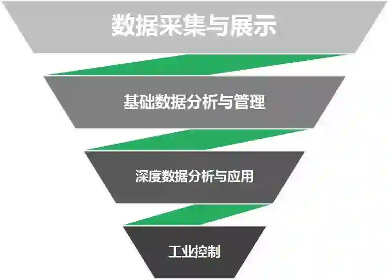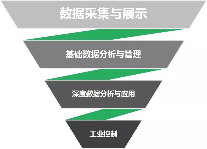 如果把物联网在行业里的应用抽象出来,我们可以总结为四个层次:数据的采集与展示、基础的数据分析与管理、深度数据分析与应用、工业控制。