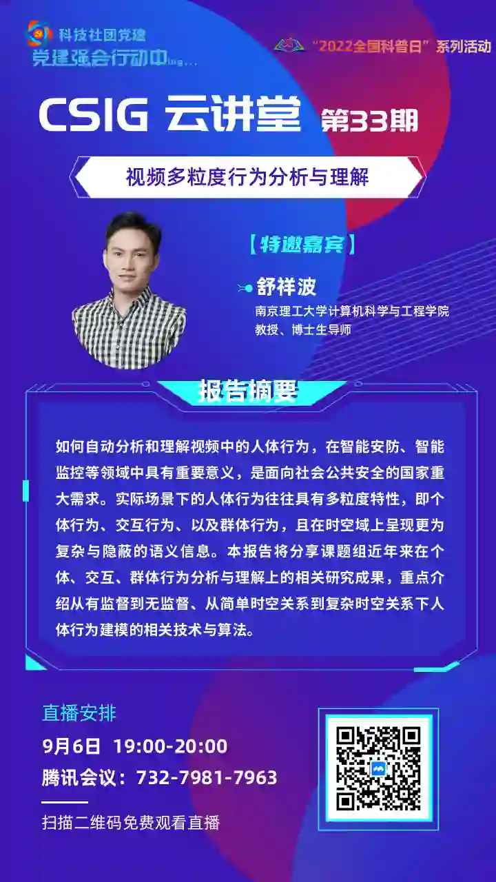 舒祥波,南京理工大学计算机科学与工程学院教授/博士生导师、“社会安全信息感知与系统”工信部重点实验室秘书长、国家优秀青年基金获得者、江苏省杰出青年基金获得者、CCF/IEEE高级会员。主要研究方向为多媒体分析、行为分析与理解、人脸分析。在TPAMI、TIP、TNNLS、CVPR、ICCV、ACM MM等国际期刊/会议上发表学术论文70多篇;获ACM MM 2015最佳论文提名、MMM 2016最佳学生论文奖、江苏省优秀博士论文奖、中国人工智能学会优秀博士论文奖、CCF-腾讯犀牛鸟科研基金;入选江苏省青年人才托举工程、江苏省333高层次人才培养工程;主持或参与国家自然科学重点/面上/青年基金、科技创新2030“新一代人工智能”重大项目课题等科研项目。担任CSIG青工委副秘书长,Information Sciences、The Visual Computer编委,IJCAI、AAAI等会议高级程序委员,TPAMI、TIP、TNNLS、ICML、NeurIPS等期刊与会议审稿人。