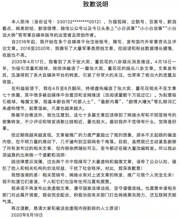 微信公众号“小白天下”持有者陈某通过其个人自媒体渠道刊登一篇《致歉说明》,承认为吸引流量和眼球,在利益驱动下,围绕“阿里蒋凡事件”在两个月内编造了70余篇黑稿全网推送,阅读量过亿。并称幕后另有黑手,自己遭受利用。“我正式道歉,请大家原谅!”陈某表示,其在诸多平台拥有“小白说事”、“小小白说事”、“小白看大势”等多个账号。“蒋凡事件”发生后,其通过上述账号持续编造了70余篇内容,总阅读量过亿。不仅得到各平台的高频全网推送,更遭到不明网络势力的猛烈传播。