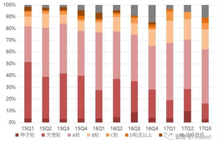 通过对融资轮次的分析,我们发现,医疗健康领域的种子轮、天使轮融资比重相比于2015年Q1,已经缩小了两倍还多。