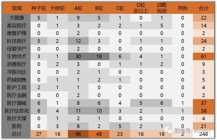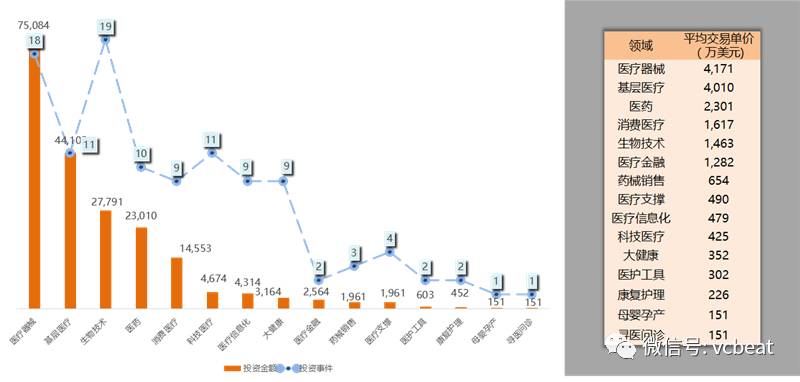 在细分领域的投资热度分布上,有一定技术壁垒的细分领域,如医疗器械、生物技术的投资热度比较高;而服务模式创新的领域,如母婴孕产、寻医问诊的投资热度在降低。
