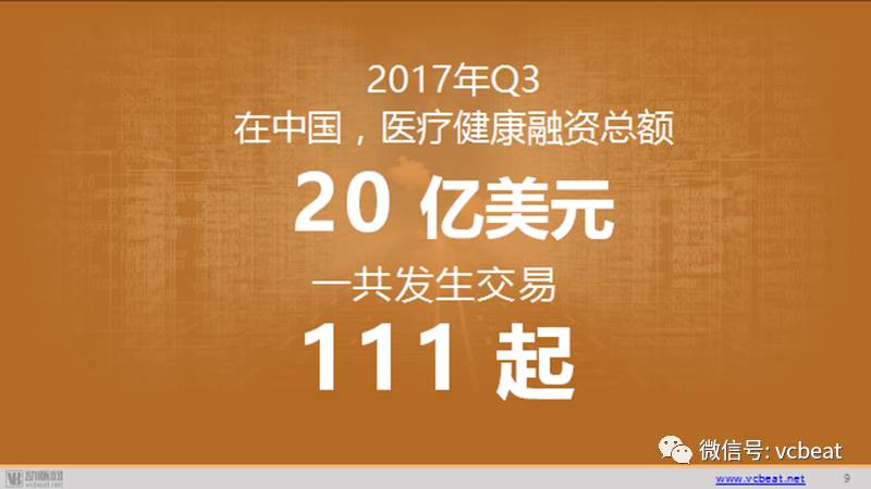2017年Q3医疗健康领域总融资额约20亿美元,同比下降9% ,环比上升58% 。