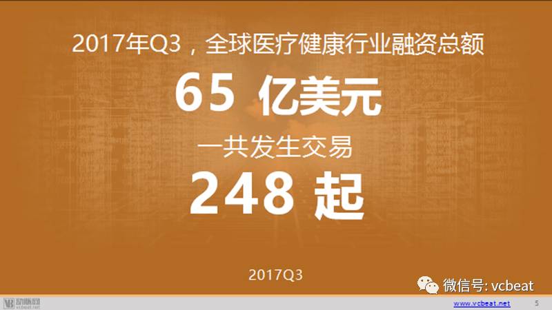 报告显示,Q3季度,全球总共发生了248起交易,总融资金额达到了65亿美元,为史上融资额最高的季度。截止2017年9月30日,全球医疗健康领域融资规模已经超过2016年全年。