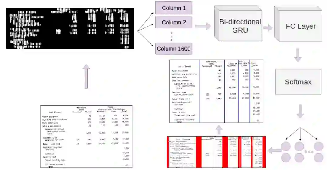 本文提出了一种鲁棒的基于深度学习的表格结构提取方法,能够从文档图像的表格中高精度地提取行和列。在该方法中,首先对表格图像进行预处理,然后将其输入带有门控递归单元(Gated Recurrent Unit,GRU)的双向递归神经网络,然后通过 softmax 激活实现全连接层。网络从上到下、从左到右扫描图像,并将每个输入分类为行分隔符或列分隔符。该方法的核心就是 GRU 的引入,与传统的基于 CNN、启发式算法的方法相比,基于序列的模型可以有效捕捉表格中重复的行 / 列结构,因此能够大大改进表格结构识别的性能。