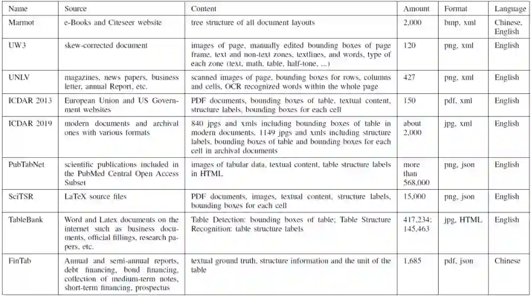 首先,作者回顾了以前发布的用于表格识别任务的数据集,然后介绍了表格识别的不同方法。