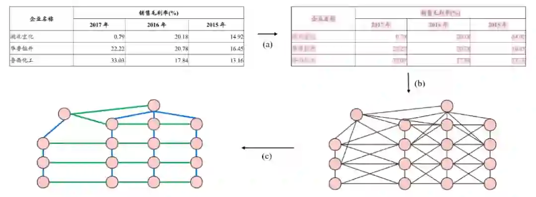 GFTE 可以概括为以下步骤:(a) 构建基本事实,包括表格区域的图像、文本内容、文本位置和结构标签。(b) 基于单元格构造一个无向图 G=<V, R_C>。(c)使用 GFTE 来预测相邻关系,包括垂直关系和水平关系。表 3 给出一个任务示例(表格文字已经转换为英文)。