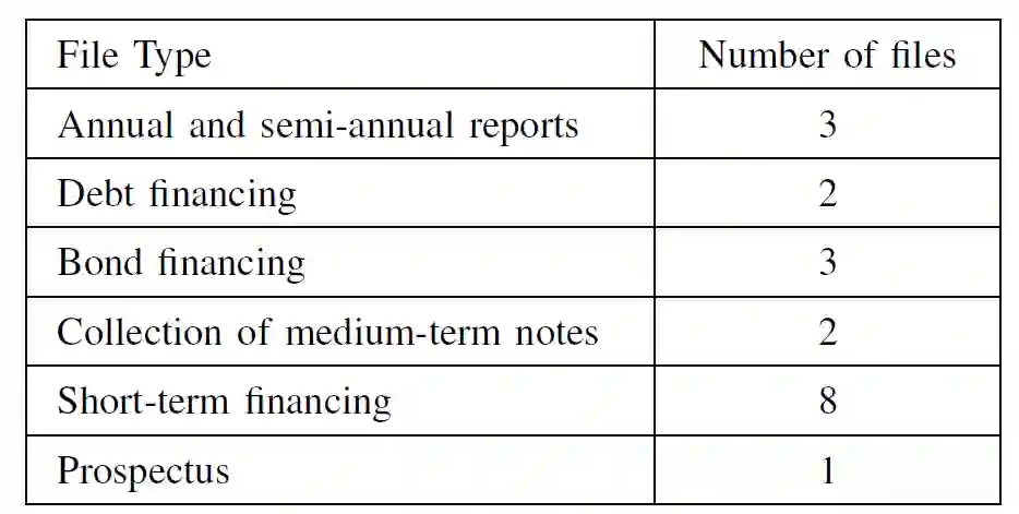作者分析,现有的应用于表格识别任务中的数据集存在下述两个问题:1)从财务文档中提取表格信息的方法和标准数据集很少。2) 表格信息提取的来源缺乏多样性。本次发布的基准数据集 FinTab 旨在解决上述问题。在这个数据集中,总共收集了 19 个 PDF 文件和 1600 多个表格。具体文件分类见表 2。所有文件总计 3329 页,其中 2522 页包含表格。为了保证表格类型的多样性,除了表格的基本形式外,FinTab 中还包括了不同难度的特殊表格形式,如半规则表格、跨页表格、合并单元格表格、多行标题表格等。FinTab 中共有 119021 个单元格,合并单元 2859 个,占 2.4%。