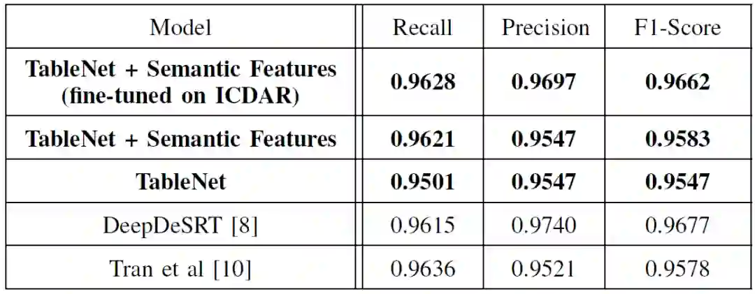 本文实验是基于 ICDAR 2013 表格竞赛数据集完成的。作者根据召回率、查准率和 F1 分数对模型性能进行评价,对每个文档计算这些度量值,并在所有文档中取其平均值。本文使用的 Mamot Extended 数据集中共有 1016 份文件,包括中文和英文表格,其中 509 份英文文件附有注释,并用于训练。使用 Tensorflow 实现该深度学习模型,并在一个使用 Intel(R)Xeon(R)Silver CPU(32 核)和 128 GB Tesla V100-PCIE-1 GPU 的 RAM 和 6GB GPU 内存的系统上完成实验。