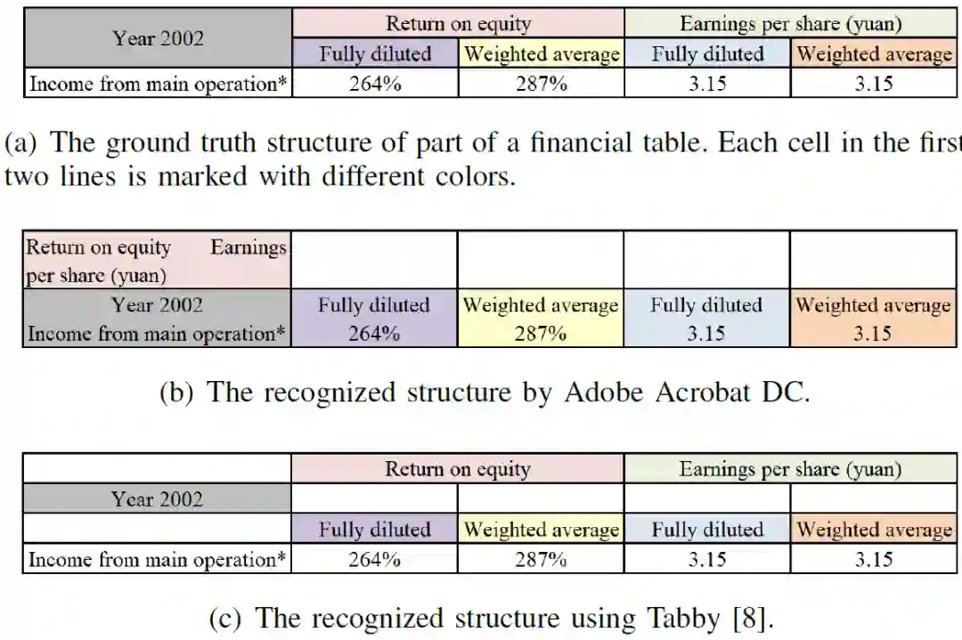 首先,作者给出了一个经典的表格识别问题示例。图 1 给出了两个已有的表格内容提取方法的效果,即 Adobe Acrobat DC 和 Tabby[1]。在示例中的表格应用这两种方法都无法正确提取表格内容。同时,不难发现在跨单元格的情况下,由于这些单元格很可能携带表头的信息,表格识别经常会出现问题。因此,表格抽取方法的性能仍有待提高,尤其是在复杂的情况下对于表格的提取和理解至关重要。