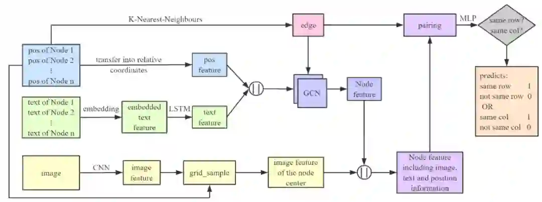 图 5 给出了基于图的卷积网络 GFTE 的结构。首先将绝对位置转换为相对位置,然后用这些位置来生成图。同时,将纯文本嵌入到预先定义的特征空间中,然后使用 LSTM 来获取语义特征。将位置特征和文本特征连接在一起,并将它们传送到一个两层图卷积网络(GCN)。同时,作者使用了一个小内核算子对图像进行膨胀,使表格的线条更粗。还将图像调整为 256x256 像素,以便使输入的图片正常化,然后利用三层 CNN 计算图像特征。最后,利用节点的相对位置,计算出流场网格。利用网格中输入的像素位置计算输出,可以得到某个节点在某一点上的图像特征。这三种不同的特征都得到后,将生成的图的一条边上的两个节点配对,即,找到一条边上的两个节点,并将它们的三种不同的特征集合在一起。最后,使用 MLP 来预测两个节点是在同一行还是在同一列中。