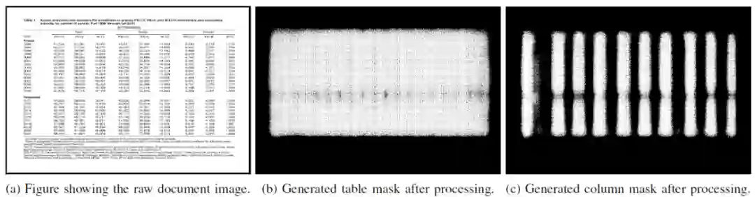 文章中使用 Adam 优化器和二进制交叉熵损失函数来训练模型。典型的表格图像包含的行和列的数量要多于它们之间的空白,为了解决这种类不平衡问题,作者对损失函数进行了加权,使错误预测的行列元素的惩罚仅为错误预测的空白元素的 66%。