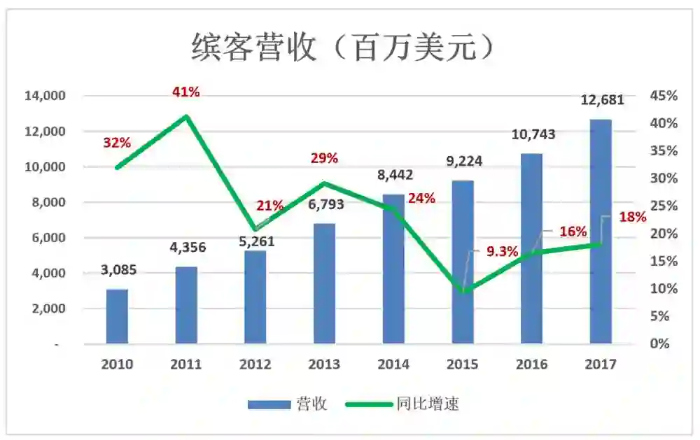 2017年,缤客营收126.8亿美元(约为携程的三倍),同比增长18%。2015年,缤客增速曾跌破10%。2016年、2017年,在没有进行较大并购的情况下,营收增速显著回升,算得上是“内涵式发展”。
