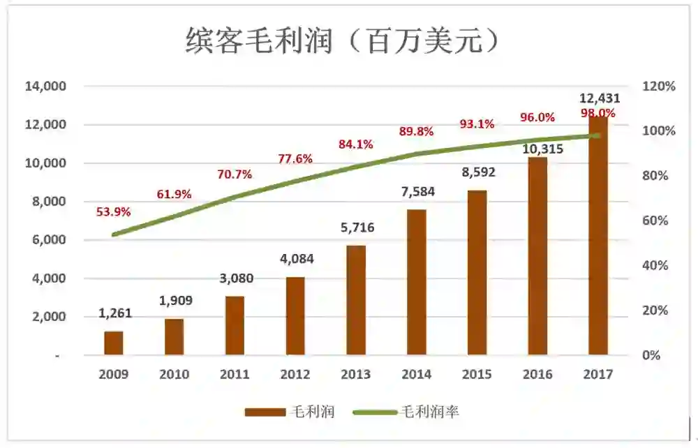 下面见识一下真正互联网公司的毛利润率。2017年,缤客营收126.8亿美元,毛利润124.3亿美元,毛利润率高达98%,比茅台酒还高一大截。携程毛利润率在80%左右。