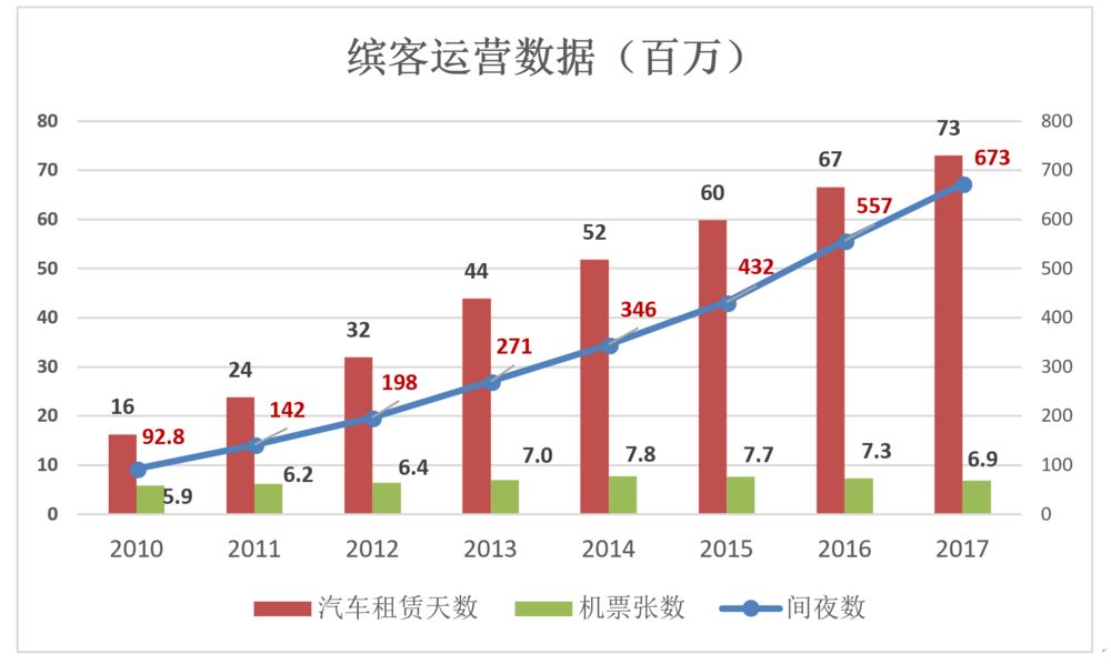 2017年,缤客酒店预订间夜数达6.73亿,同比增长21%;汽车租赁总天数达7300万,同比增长9.6%。