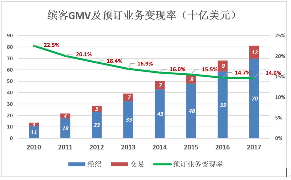 2017年,缤客平台“经纪”、“交易”成交额分别为697亿美元和115亿美元,合计812亿美元(相当于GMV),以此为分母可算出总变现率为15.6%。扣除8.34亿美元广告收入,2017年缤客预计业务变现率为14.6%。