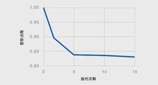 通过选定同一模型、给定batch size,可以更好地观察遗传算法优化显存占用的情况。如图3所示,随着迭代次数的增加,遗传算法逐渐收敛显存占用,并在第5次迭代之后达到一个较稳定的状态。