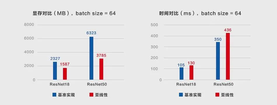 MegEngine基于亚线性显存技术开展了相关实验,这里固定batch size=64,在ResNet18和ResNet50两个模型上,考察模型训练时的显存占用和计算时间。
