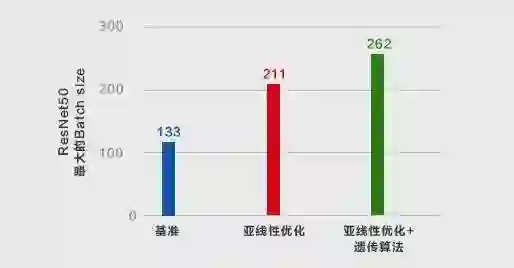 如图2所示,采用型号为2080Ti的GPU训练ResNet50,分别借助基准、亚线性、亚线性+遗传算法三种显存优化策略,对比了可使用的最大batch size。仅使用亚线性优化,batch size从133增至211,是基准的1.6x;而使用亚线性+遗传算法联合优化,batch size进一步增至262,较基准提升2x。