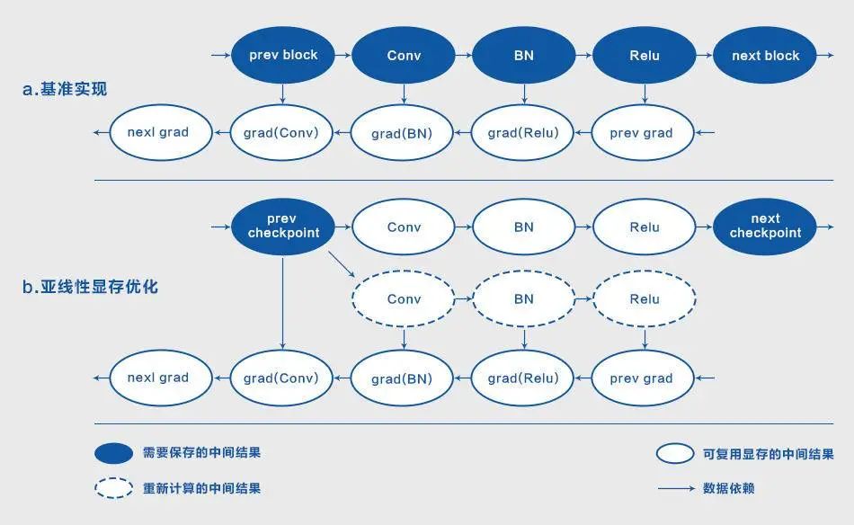 图1:亚线性显存优化原理,其中 (b) 保存了Relu结果,实际中Relu结果可用in-place计算