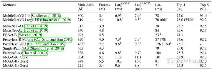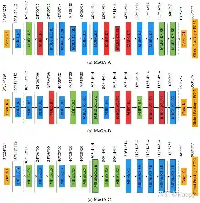 总而言之,作者讨论了手机端神经网络架构设计中的几个关键因素。首先,作者提出了首个手机端GPU模型解决方案(这是因为在实际产品中,因其第延迟,低开小,在GPU上运行网络更受欢迎,已有工作更多关注于CPU端模型设计);其次,过拟合并非手机端模型的主要考虑因素,因而可以释放出更多的表达能力以拟合其他约束;最后,作者在MnasNet与MobileNetV3基础上,采用NAS进行手机端架构搜索,得到一类SOTA性能的网络MoGA-A,MoGA-B以及MoGA-C。