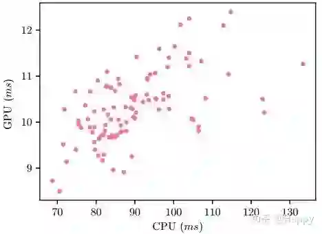 近期的NAS方法更多着重于手机CU端,对手机GPU端的关注极少。在实际应用,轻量型神经网络主要部署到手机GPU,DSP以及NPU上,CPU则是最后不得已之下的选择。为进一步说明CPU延迟与GPU延迟之间的关联性,作者随机评估了100个模型在CPU与GPU端的延迟对比(见下图)。从中可以看出:两者并无明显的线性关系。因此,特定平台的架构搜索更有必要性。