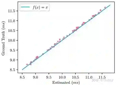 由于该搜索空间中每个模块均具有固定的输入,因而可以采用统计延迟方式制作查找表。然后将延迟采用逐层累计方式得到模型的延迟耗时。GPU实际延迟与预测耗时对比见下图,误差不大于0.0571ms.