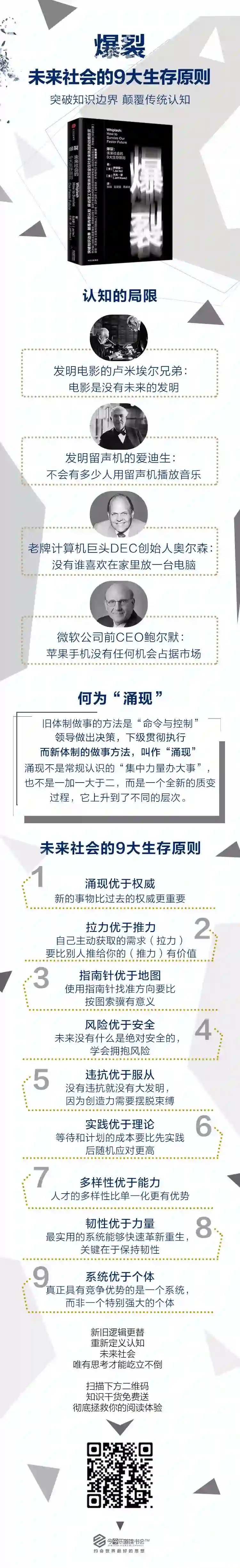 《爆裂》一书包含了非凡的案例研究和来自麻省理工学院媒体实验室等机构的前沿研究和哲学理念,它将帮助你适应这个难以预测的世界,并获得成功。作者在书中提出了未来社会的9大生存原则,帮助人们驾驭变化,应对当下的挑战。它们分别是:涌现优于权威、拉力优于推力、指南针优于地图、风险优于安全、违抗优于服从、实践优于理论、多样性优于能力、韧性优于力量以及系统优于个体。